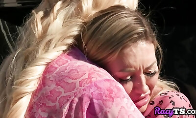 Platinum-blonde teeny beauty Emma Rosie receives her Trans MILF bestie's penis